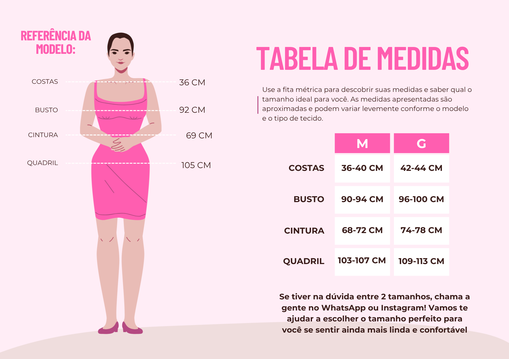 Medidas da modelo: busto 92 cm | cintura 69 cm | quadril 105 cm | altura 1,57 m